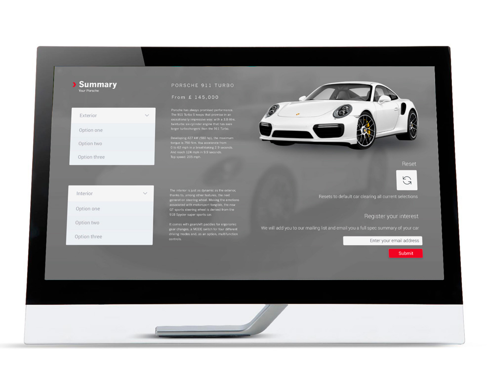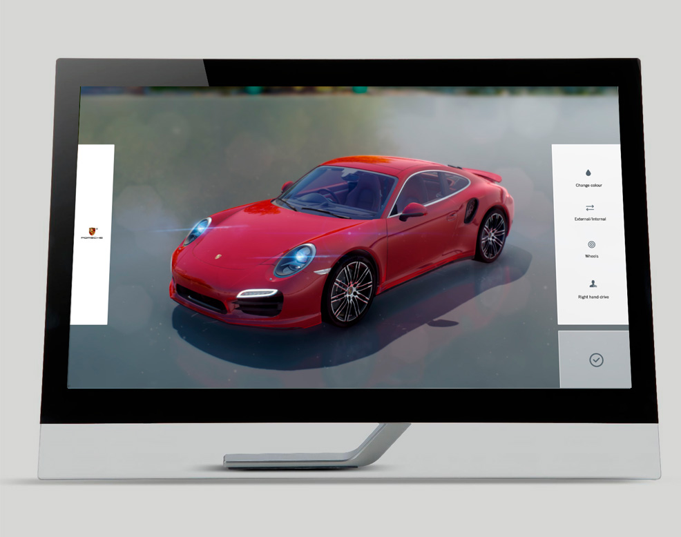 We created this showcase touchscreen marketing app for Porsche by blending insight and technical knowledge with creative expression, designing a purposeful, unforgettable app experience, a campaign to connect with people in a fresh and compelling way. Our approach was guided by the belief that simple intuitive design and a rich and interactive user experience can filter out distraction and add meaning to our proposition. Demo project.