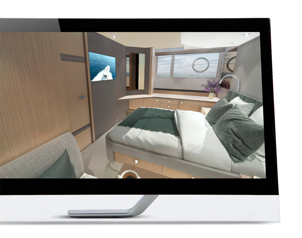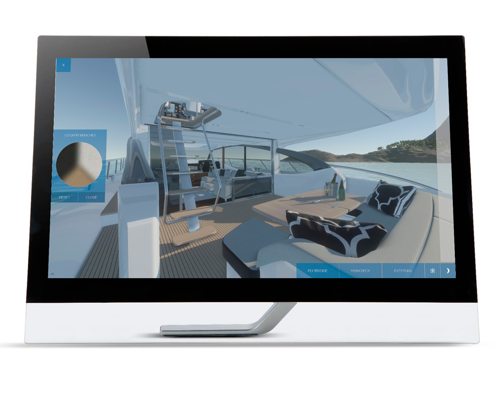 Building on the work already done on the app version we developed a large touchscreen version of the yacht configurator for use at exhibitions, or other dedicated sales areas. This larger version enables us to utilise the increased power of a high spec PC running the 3D realtime rendered interiors with all the richness and detail this allows.